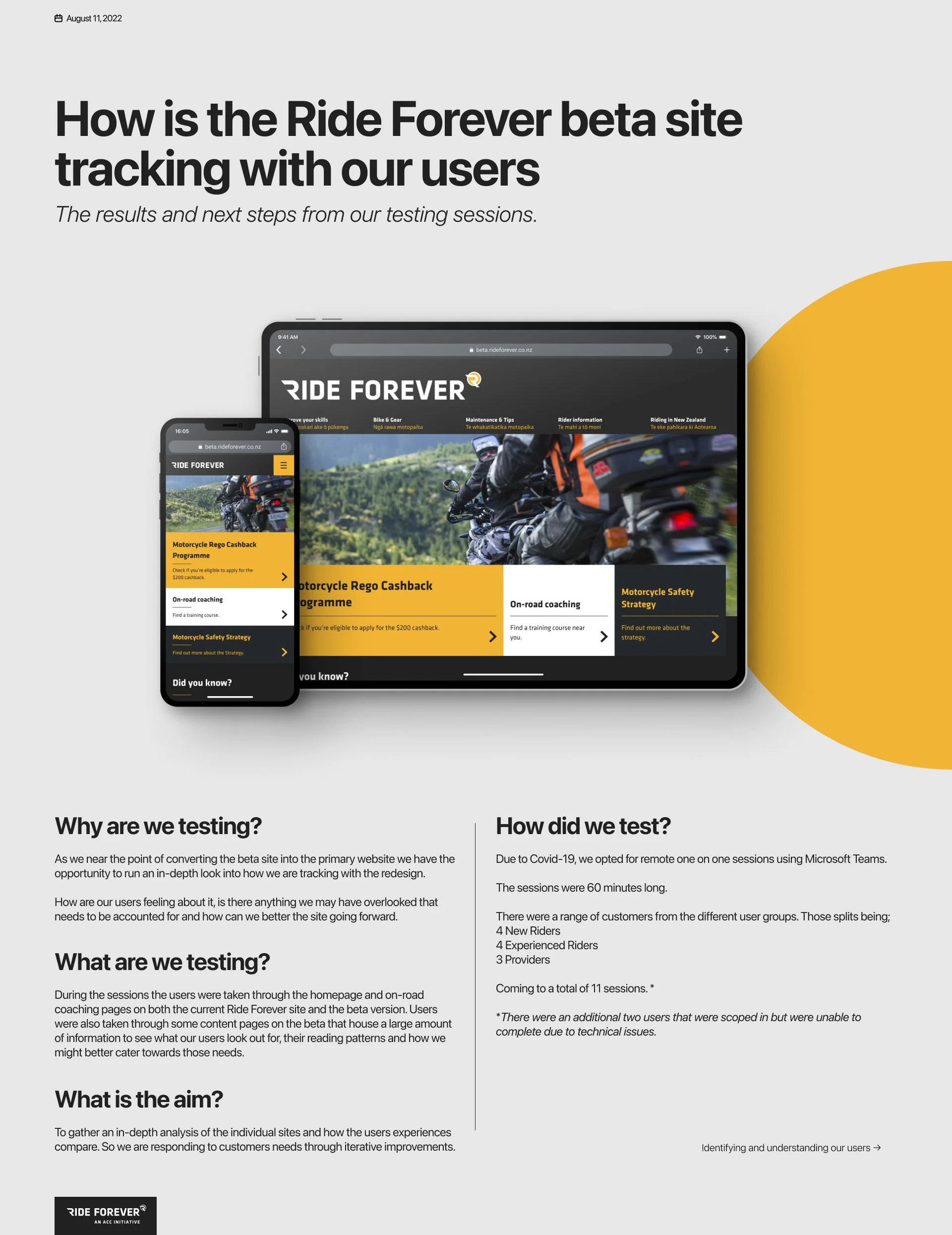 Ride Forever is an initiative run by ACC New Zealand to help educate riders and promote safer motorcycle riding on New Zealand roads. The initiative also has an informational website, designed and maintained by the Digital team at ACC. The website offers information, online learning platforms, and in-person educational courses.